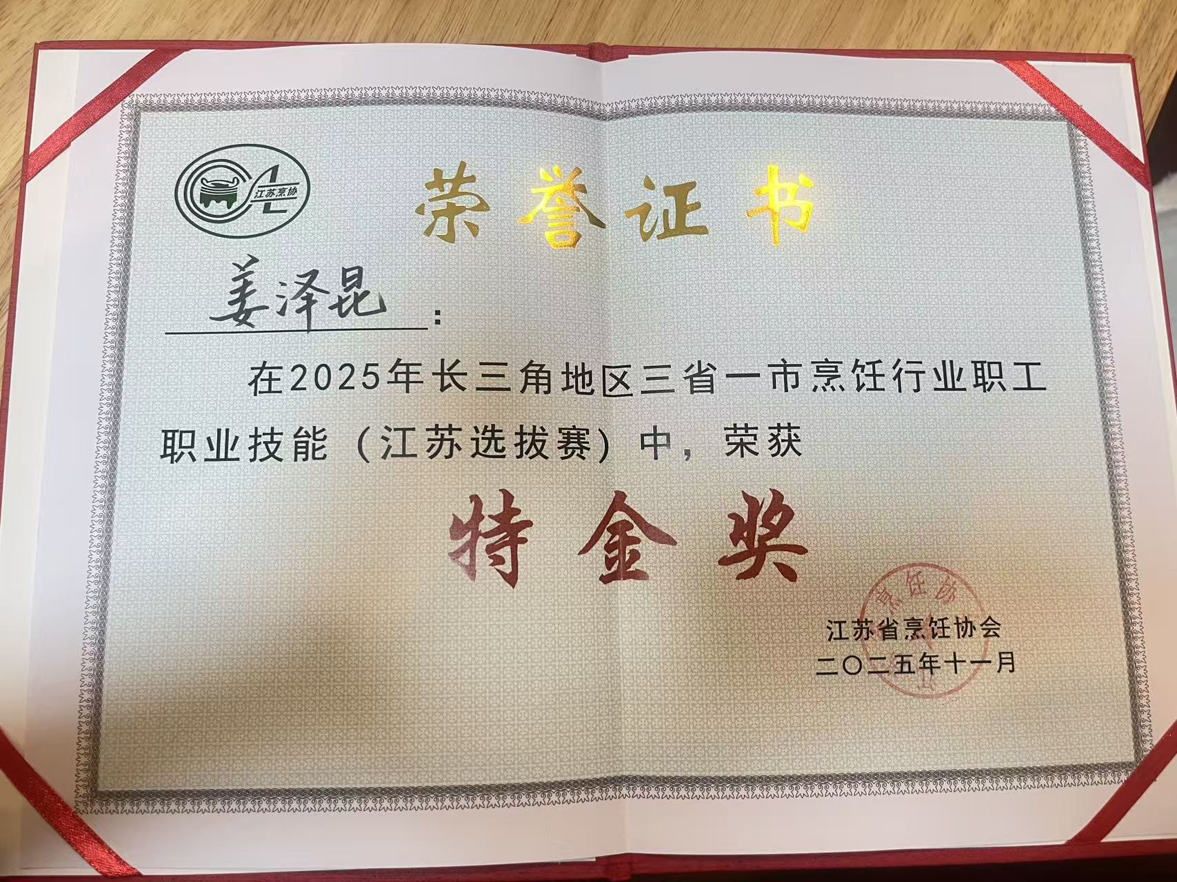 11月11日,淮安宾馆厨师姜泽昆参加“2025长三角三省一市烹饪行业职工职业技能竞赛”江苏选拔赛,参赛作品《雪绒望明月》荣获特金奖,顺利闯入决赛,并荣获“江苏省优秀烹饪工匠”称号!